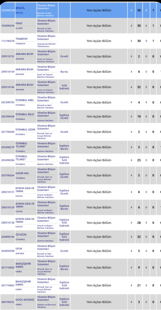 Bu üniversiteler yayınlanan ön yerleştirme klavuzuna göredir. Tespit edebildiğim devlet üniversitesinde yeni açılan ybs böümü yok….